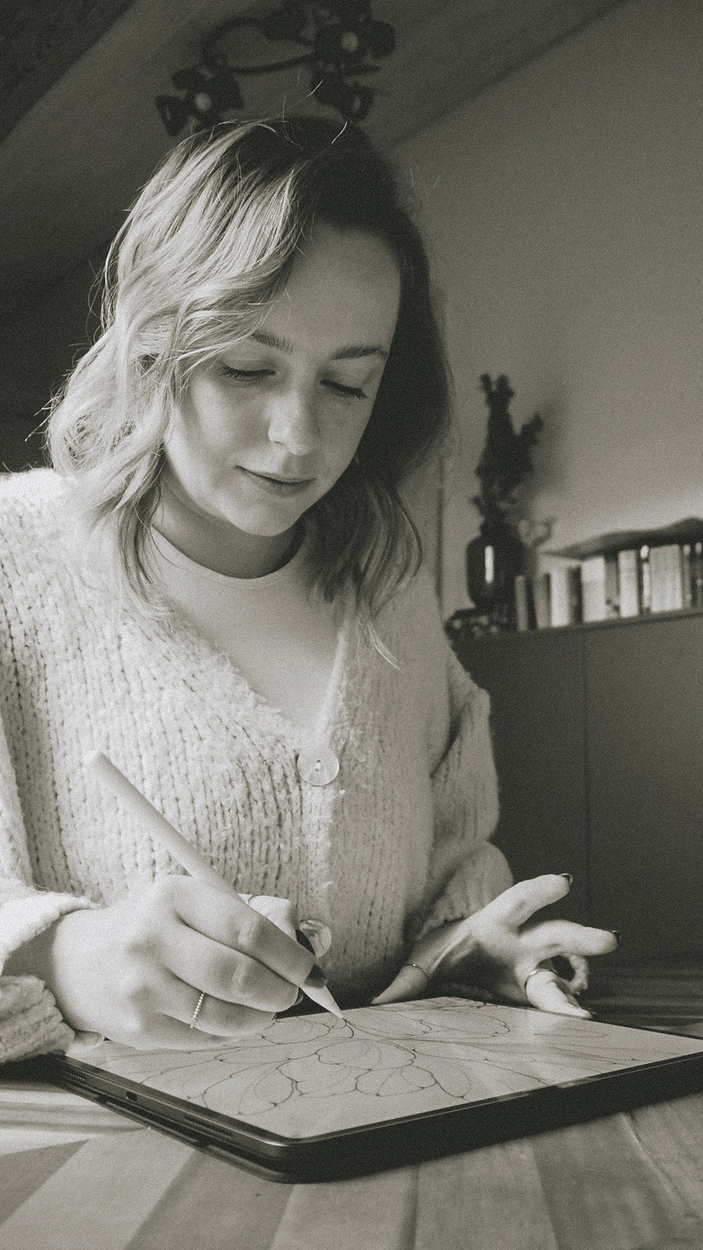 Eines Abends setzte ich mich in mein Atelier. Ich zeichnete ihren Anfangsbuchstaben und ließ die Blumen sanft in die Form hineinwachsen. Da war es: genau das Poster, das ich gesucht hatte. Zart. Leise. Besonders. Ein Stück Erinnerung, das nicht laut sein muss, um zu berühren.