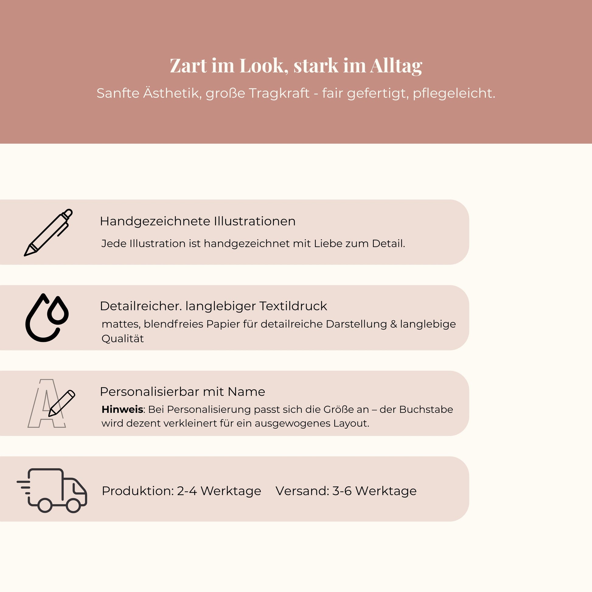 Dein perfekter Begleiter für Einkauf, Uni oder Alltag: Der Stoffbeutel aus 100 % Baumwolle verbindet Funktionalität mit zartem Design. Personalisiere ihn mit einem floralen Buchstaben deiner Wahl – optional auch mit Namen – und mach ihn zu deinem ganz persönlichen Lieblingsstück.