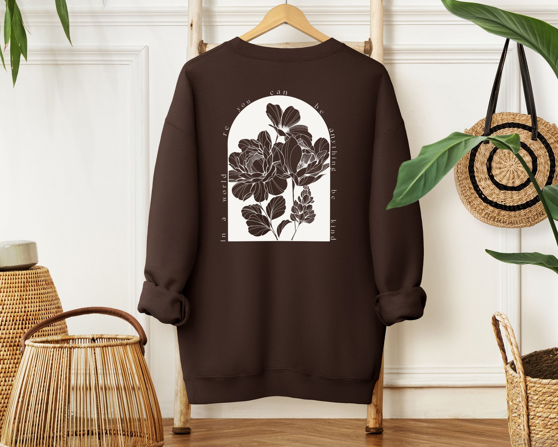 Ein Sweater, der leise erinnert: be kind. vorne – mittig, zart – und auf dem Rücken eine handgezeichnete, florale Illustration. Weich, zeitlos und unaufdringlich schön. Die feinen Linien wirken wie gepresste Blüten auf Stoff: elegant statt laut, warm statt beliebig. Für Tage, an denen Freundlichkeit dein Lieblingsstatement ist. Im Studio gestaltet und auf Bestellung für dich gefertigt.