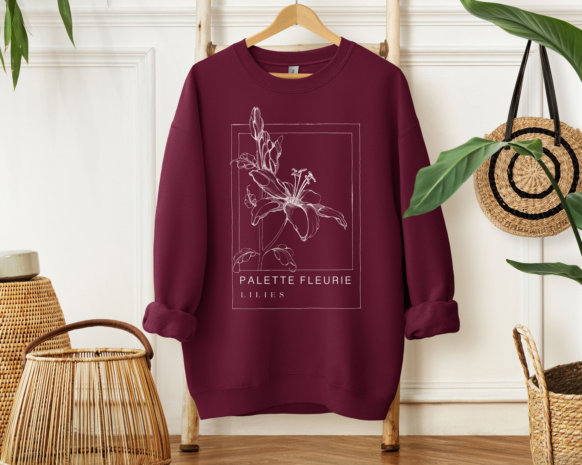 Cozy Sweater mit großem floralen Rückenprint. Die feine Lilien-Illustration im Rahmen macht aus einem Basic ein Statement – feminin, aber nicht verspielt. Lässt sich zu Jeans, Stoffhose oder über Kleidern tragen.